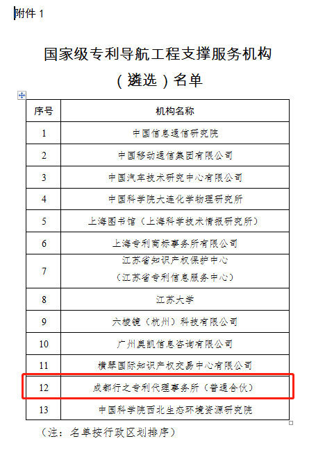 經(jīng)重重遴選,行之入選首批國家級專利導(dǎo)航工程支撐服務(wù)機(jī)構(gòu)。在成為世界知識產(chǎn)權(quán)組織技術(shù)與創(chuàng)新支持中心(TISC)、全國知識產(chǎn)權(quán)服務(wù)品牌機(jī)構(gòu)、國家知識產(chǎn)權(quán)分析評議服務(wù)示范機(jī)構(gòu)、國家專利運營試點企業(yè)、全國專利文獻(xiàn)服務(wù)網(wǎng)點后,榮膺又一國家級榮譽與責(zé)任。