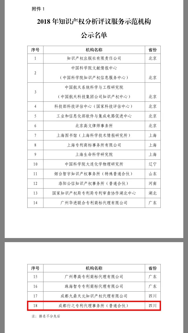 8月21日,國家知識產(chǎn)權局保護協(xié)調(diào)司發(fā)布了《關于公示2018年知識產(chǎn)權分析評議服務示范機構培育名單的通知》,行之成功獲評第二批知識產(chǎn)權分析評議服務示范機構。(目前四川省僅3家)
