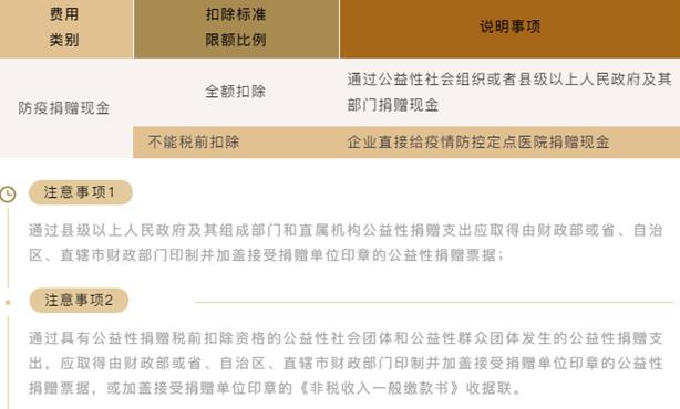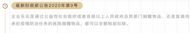 企業(yè)所得稅:公益捐贈(zèng)支出可全額稅前扣除。企業(yè)無論是通過公益性社會(huì)組織或者縣級(jí)以上人民政府及其部門捐贈(zèng)物品、還是直接向承擔(dān)疫情防治任務(wù)的醫(yī)院捐贈(zèng)物品,都可以全額稅前扣除。